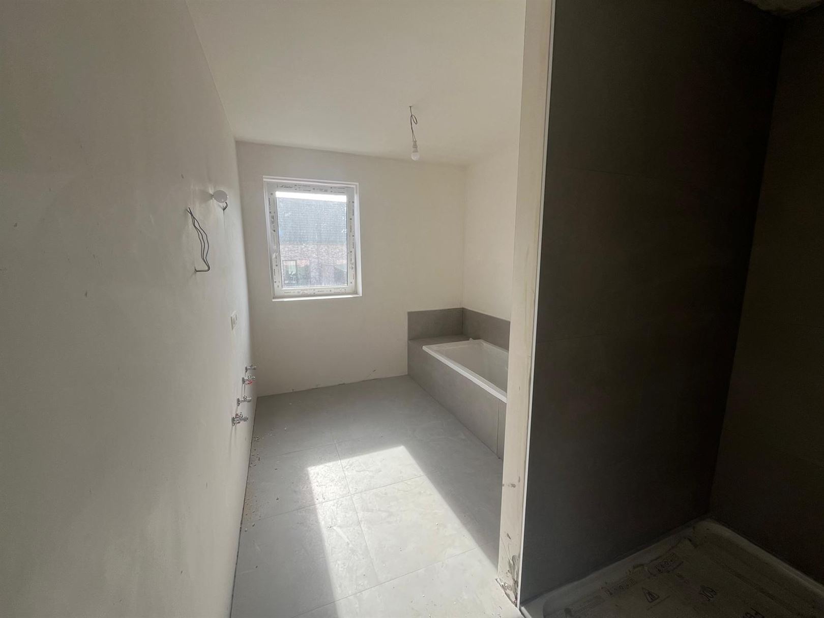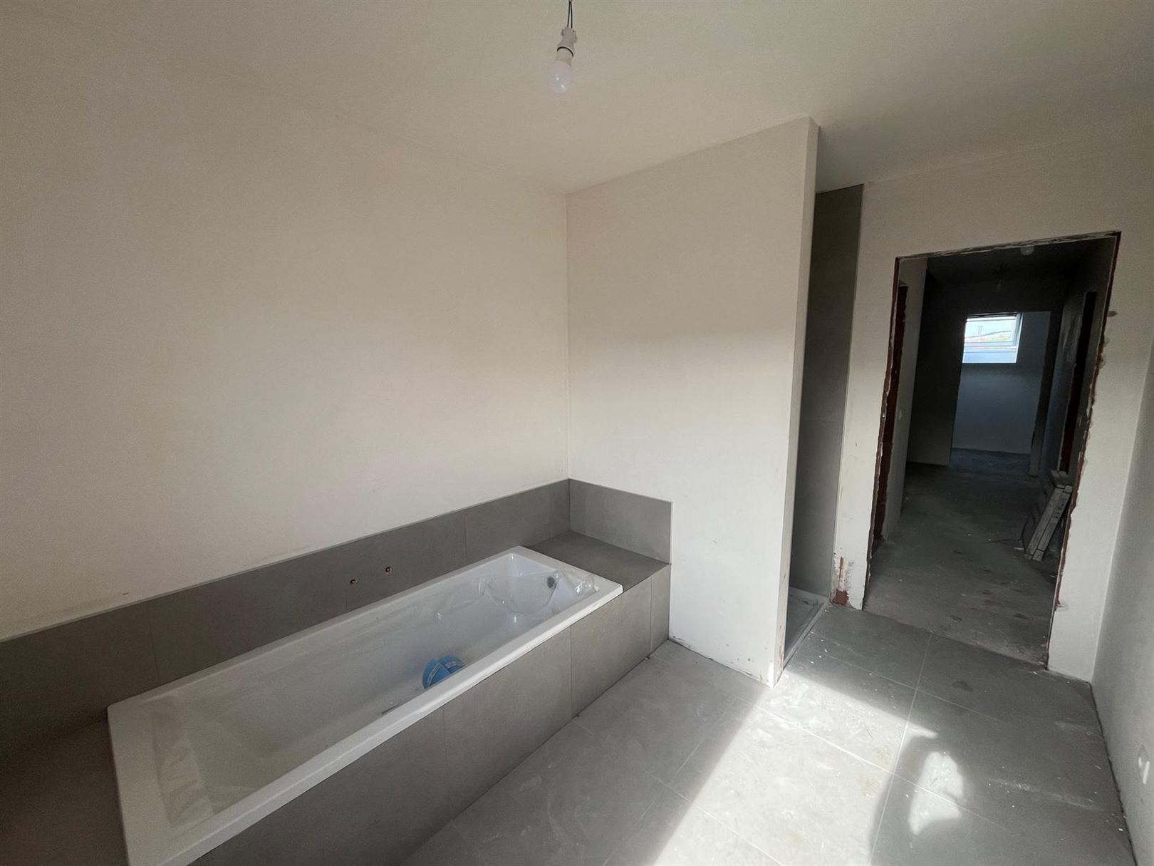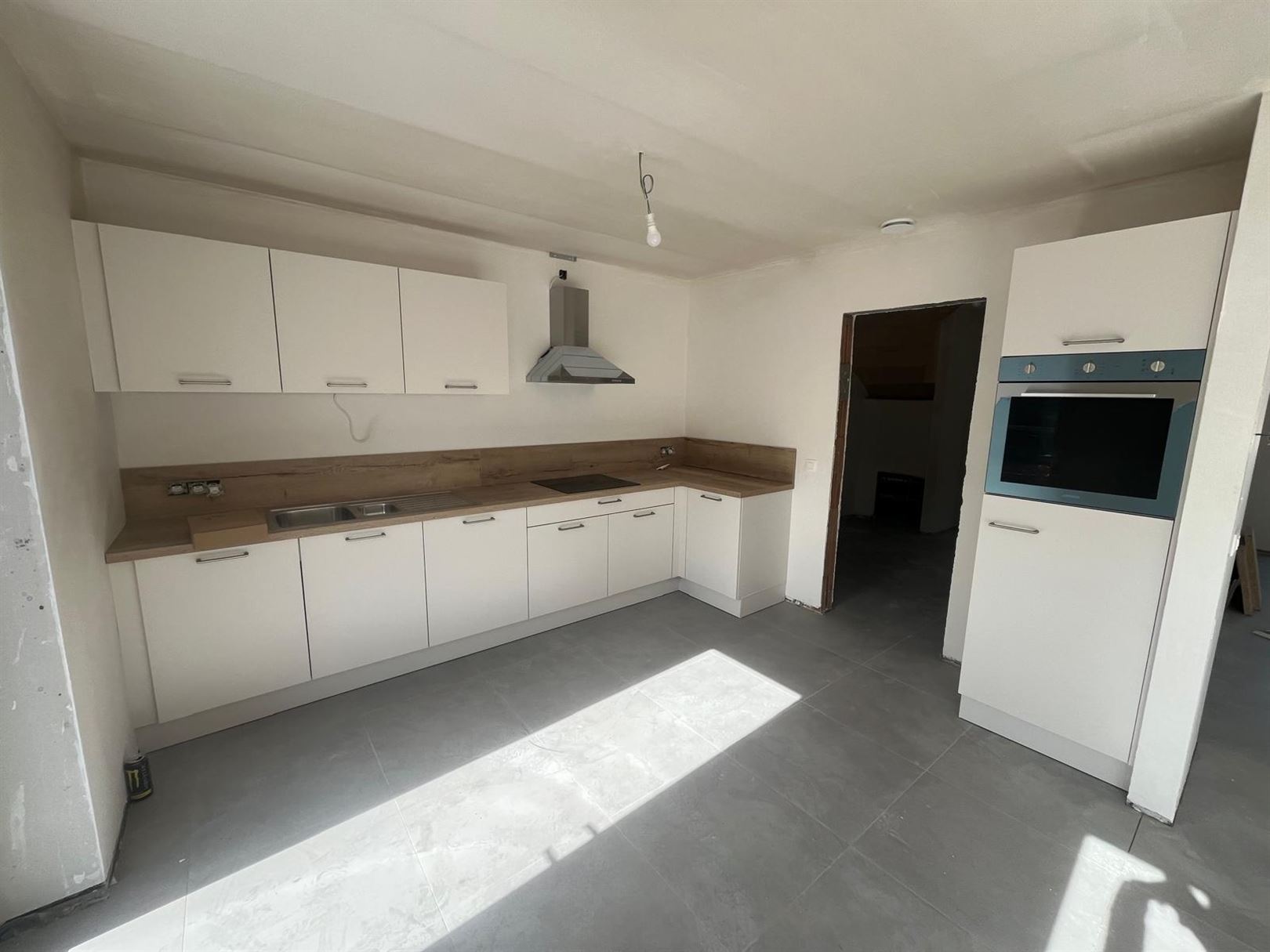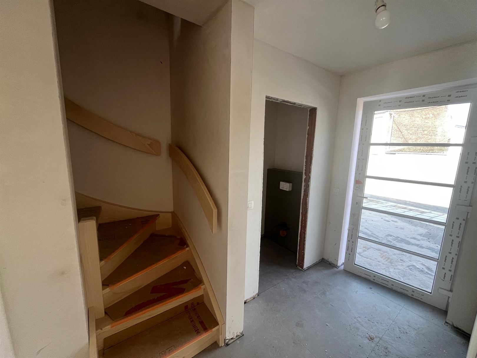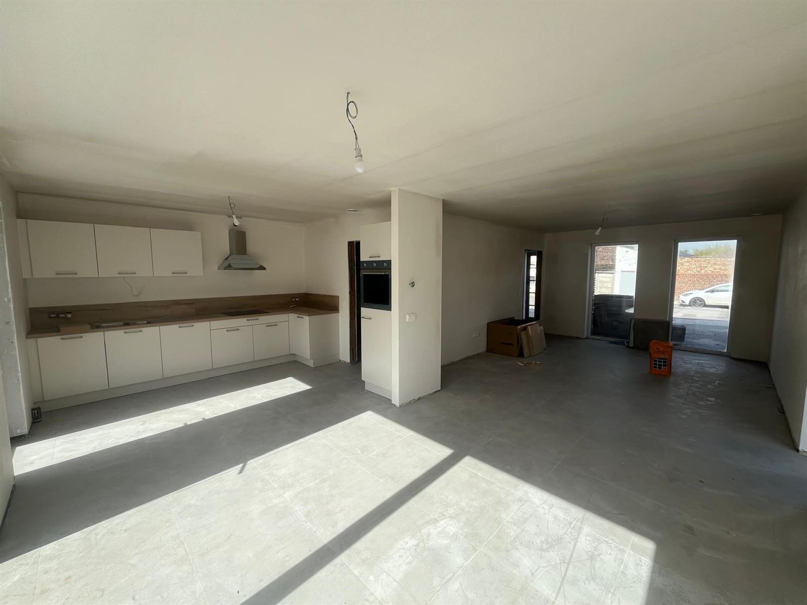 Au RDC, hall d'entrée avec WC suspendu, salon, salle à manger donnant sur cuisine équipée.