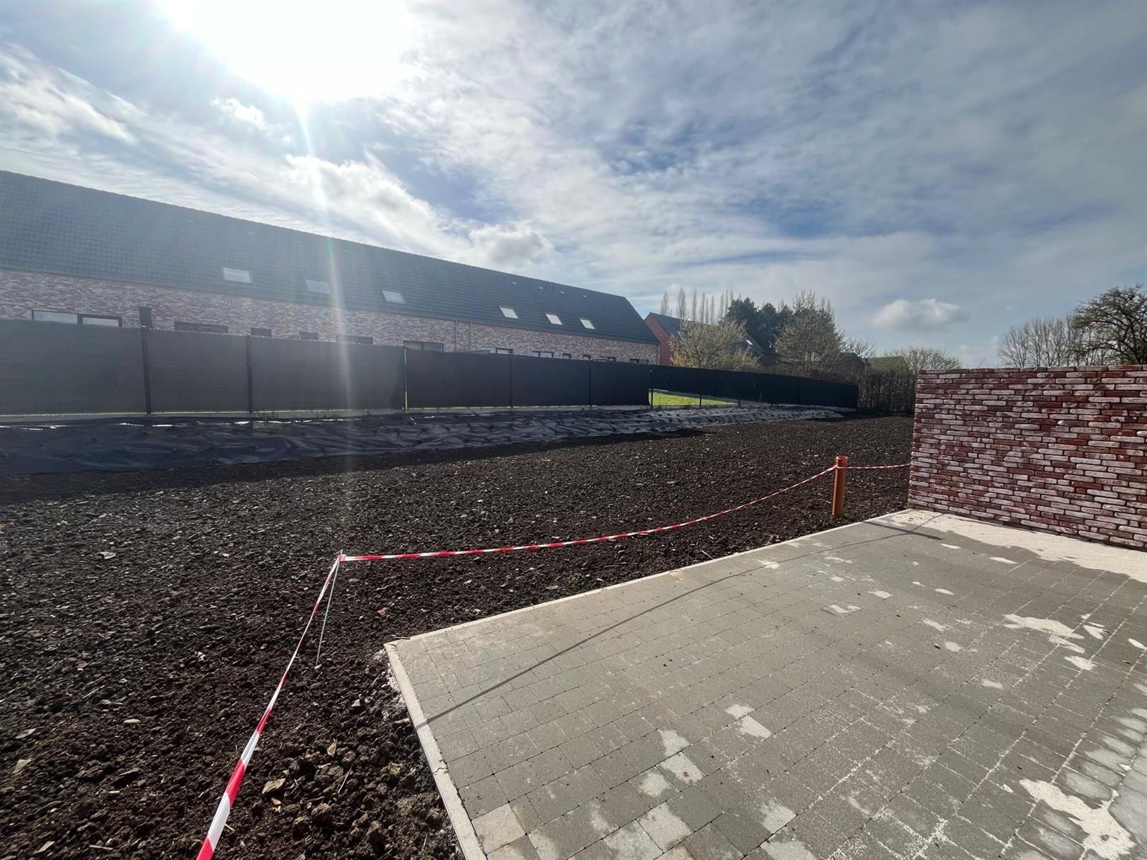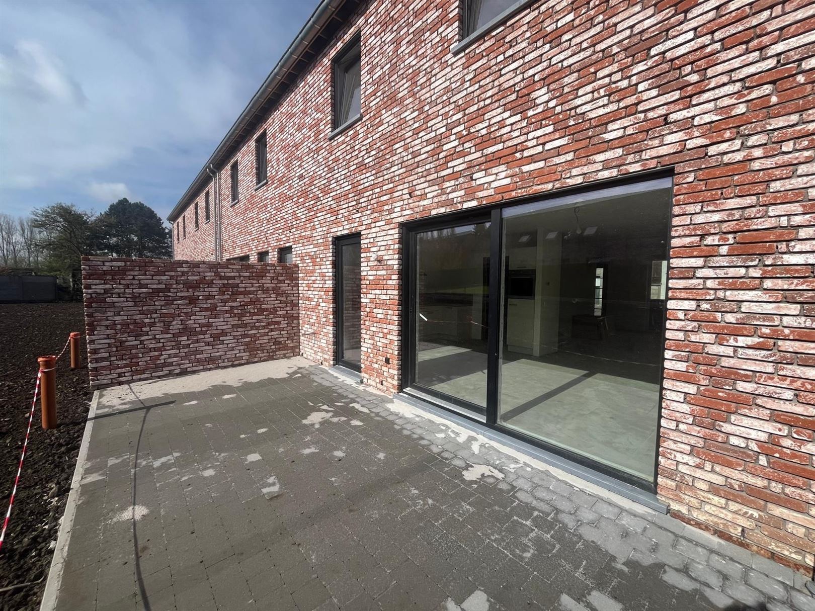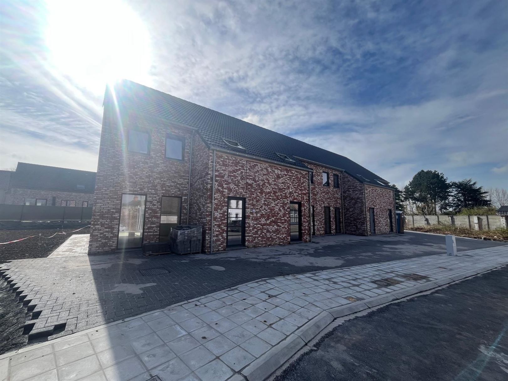 Terrasse et entrée en klinkers, plusieurs emplacements de parking devant chaque maison.